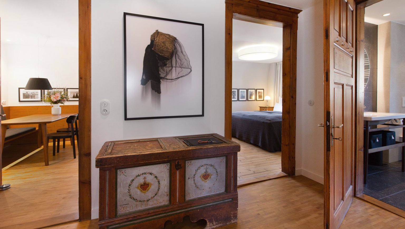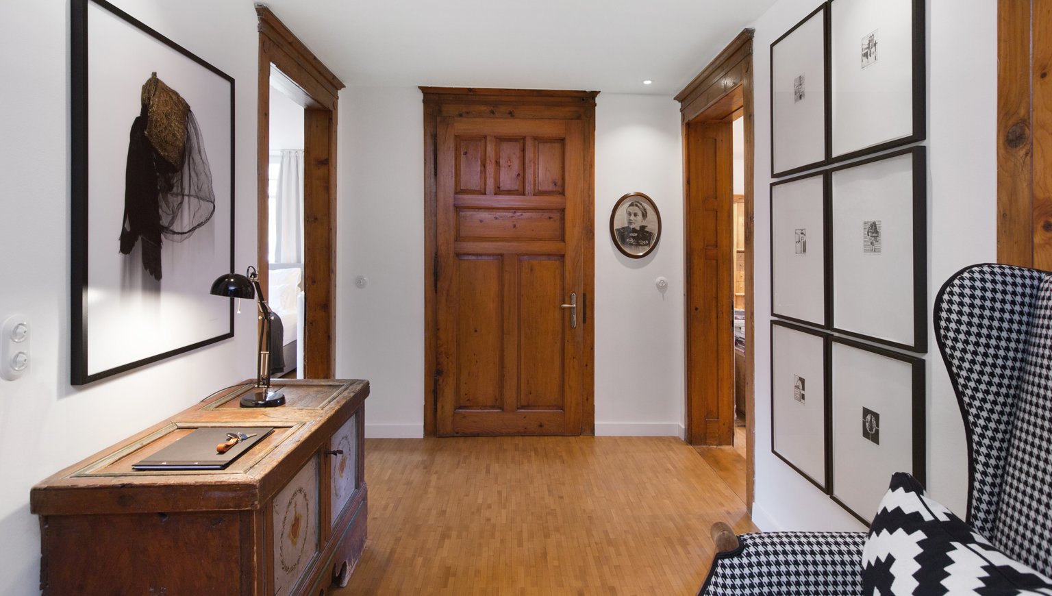 Die Wohnung Herma ist über Jahre „gewachsen“. Möbel, Fotografien und Kunst sind Teil einer persönlichen Sammlung. Neues kam hinzu, anderes blieb – und wurde weitergedacht. Moderne Einbauten und Materialien ergänzen das Bestehende, ohne es zu ersetzen.